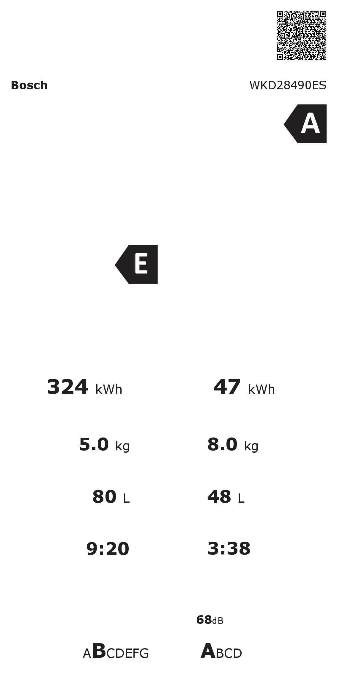 Consumo de energía / Consumo de agua de lavado y secado: 324 kWh / 80 litros